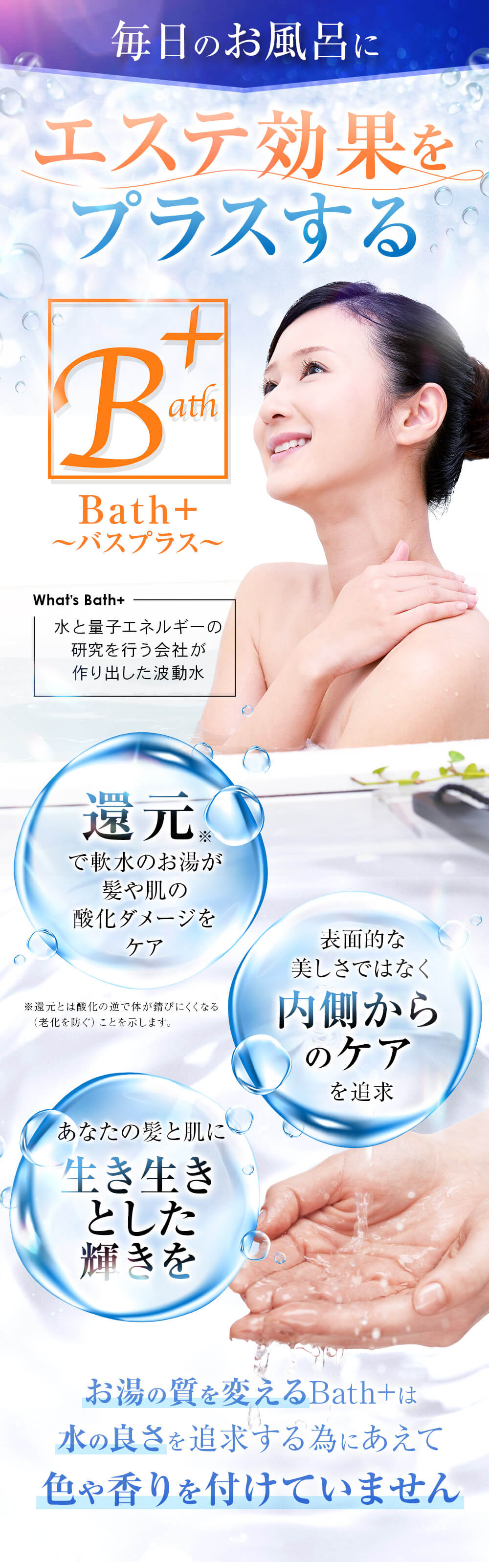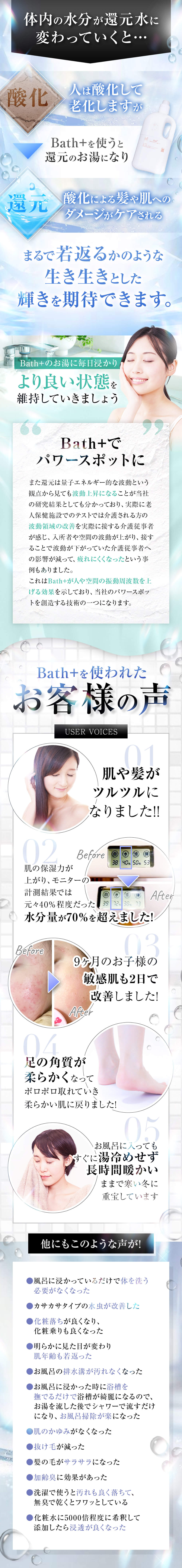 人は酸化して老化しますが、Bath+を使うと還元のお湯になり。酸化による髪や肌へのダメージがケアされる、まるで若返るかのような生き生きとした輝きを期待できます。